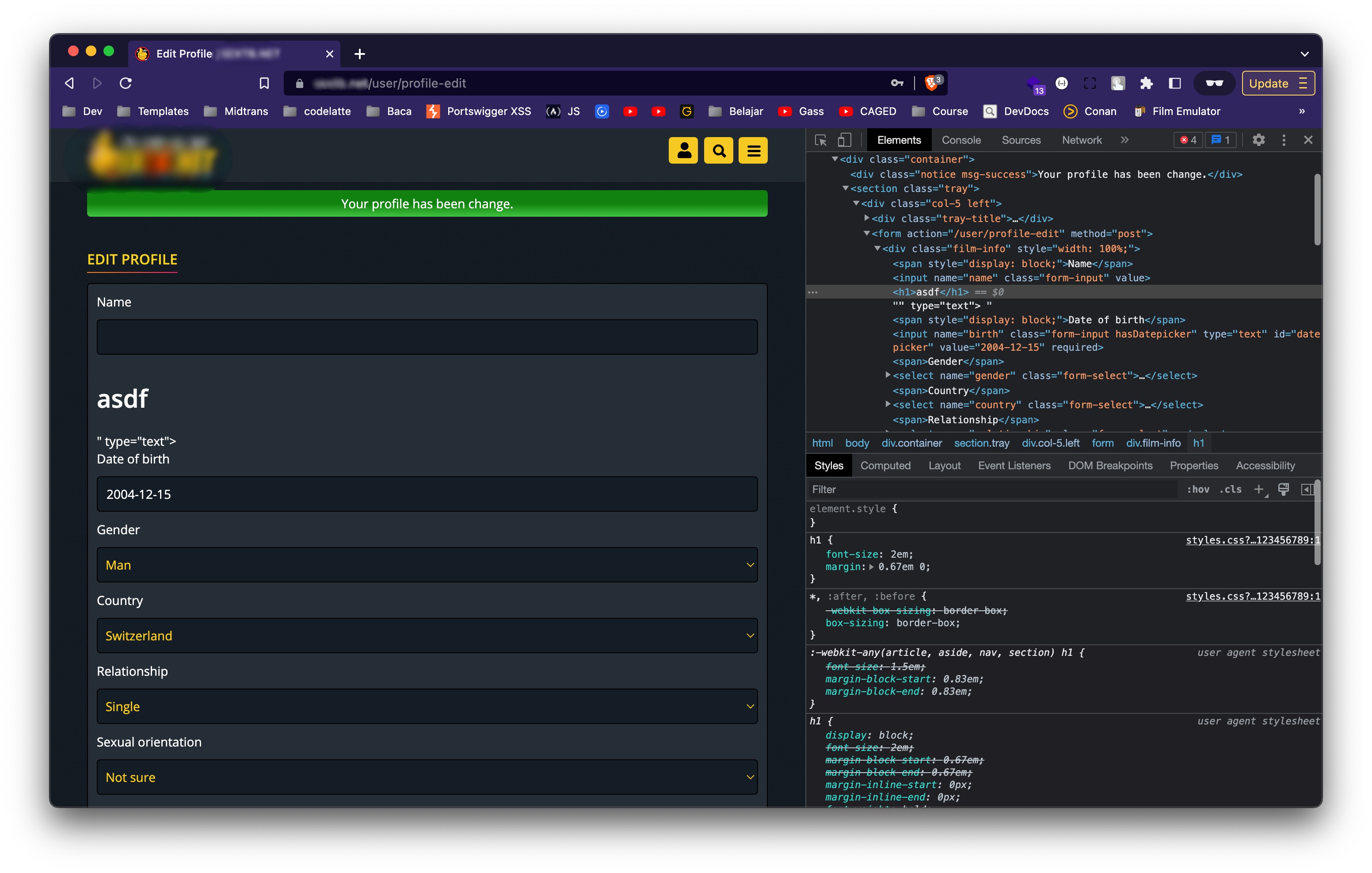 Saya rasa kebanyakan bug bounty hunter (termasuk saya) akan mencoba memasukkan payload ke setiap form yang kami temui. Dengan modal “penting yakin”, saya mengisi "><h1>asdf</h1>" pada kolom nama di halaman Edit Profile.