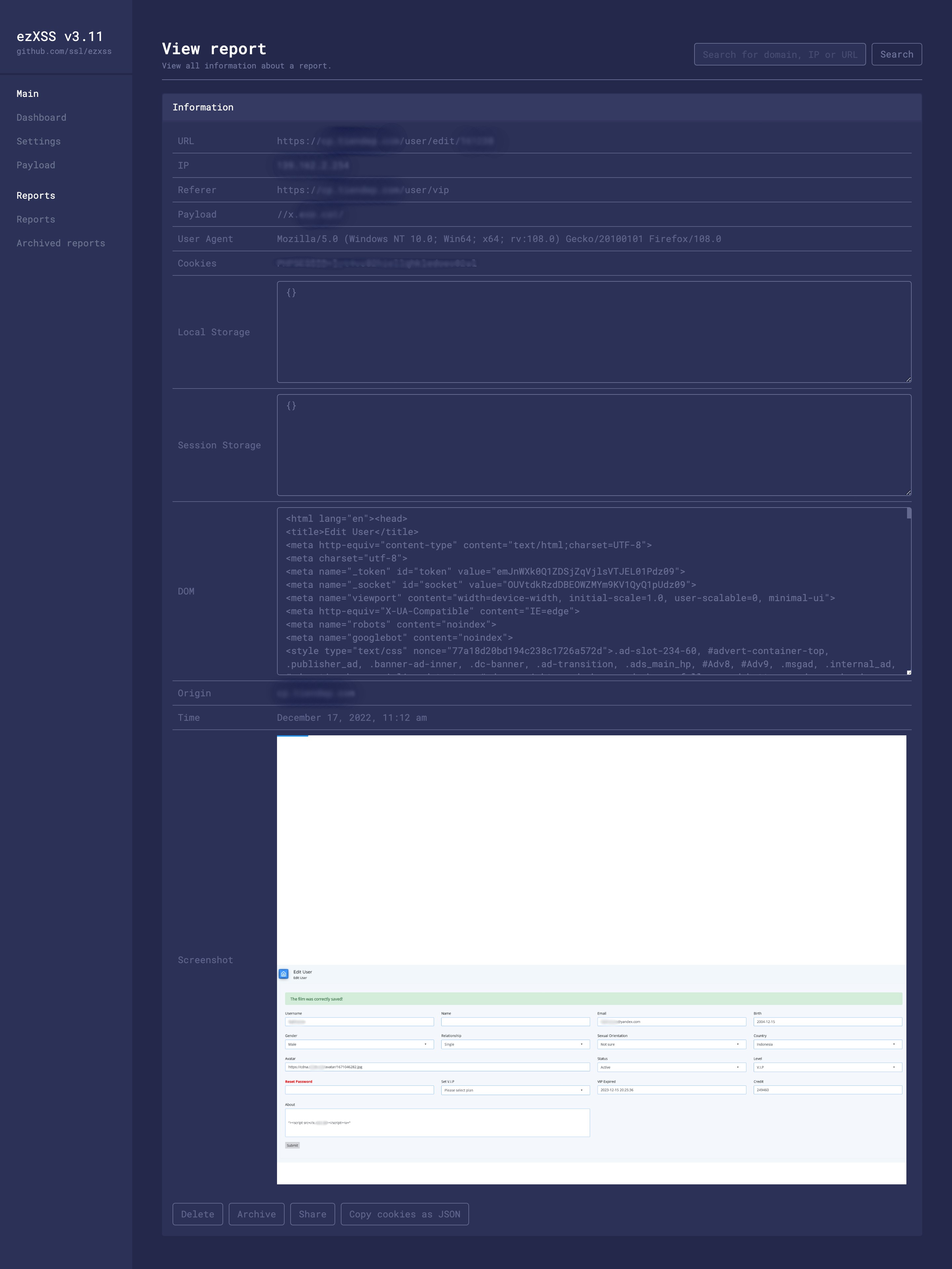 Setelah beberapa waktu menunggu, saya mendapat notifikasi bahwa payload di atas ditemukan di domain lain (cp.situslain.com) yang mana adalah dashboard admin dari situsharam.com. Berikut detail laporan dari ezXSS saat payload saya ditemukan di dashboard admin (klik gambar untuk memperbesar).