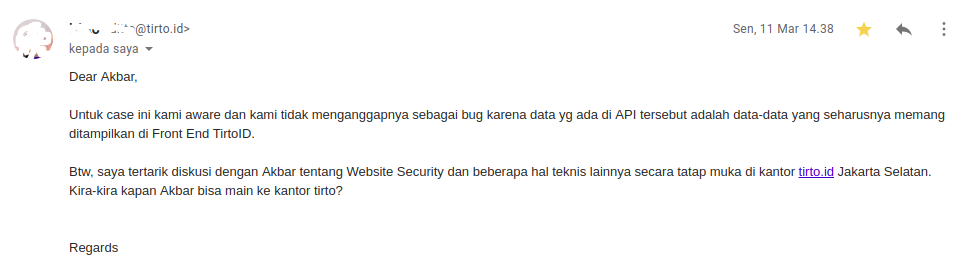 Setelah laporan temuan saya diperbaiki, saya mengirim ulang temuan bug yang lain (yang ternyata tidak valid xD), namun balasan dari pihak Tirto membuat saya sedikit takut—awalnya. Pada email balasan laporan kedua tersebut, pihak Tirto mengatakan ingin berdiskusi secara langsung, tatap muka, face-to-face, di kantor Tirto.